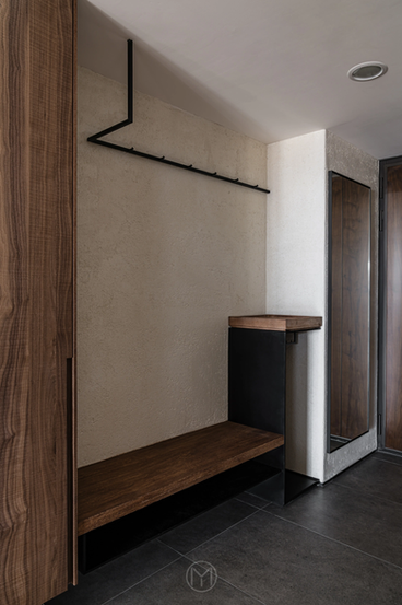 原為四房二廳的隔局,在拆除一間房間後,由玄關一進門經餐廳進客廳再延伸至書房,使四空間形成既分且合的迴遊空間。客廳與書房間採半高木皮主牆增加空間開闊感。玄關至客廳區採整面白泥牆,自然有機的泥牆將空間質感倍數提升。不多做無謂的材質,僅以鐵件搭配實木延續空間之調性。